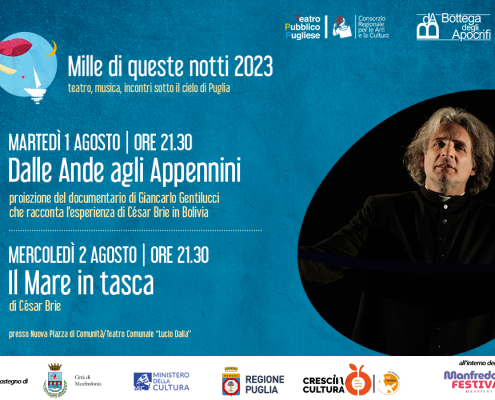 Doppio appuntamento in teatro a Manfredonia col maestro di fama mondiale César Brie. Si comincia con l’incontro con l’artista e la proiezione del documentario “Dalle Ande agli Appennini”, sulla sua incredibile esperienza boliviana. Il giorno dopo andrà in scena il suo spettacolo storico “Il mare in tasca”. Martedì 1 e mercoledì 2 agosto 2023, nella Nuova piazza di Comunità a Manfredonia.