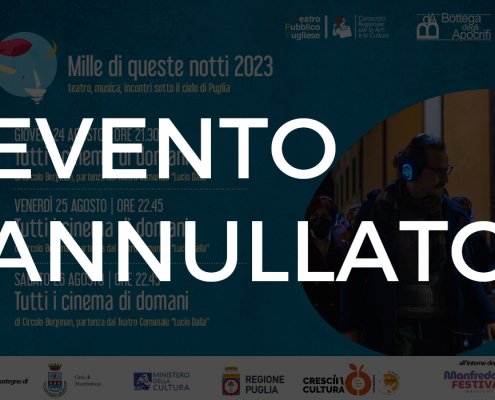 Cancellata la tre giorni dello spettacolo itinerante “Tutti i cinema di domani” per mancanza disponibilità bus cittadino. Gli appuntamenti erano programmati per il 24, 25 e 26 agosto a Manfredonia all’interno della rassegna “Mille di queste notti”.