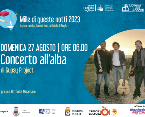 Il concerto all’alba con l’ensemble Gypsy Project chiude “Mille di queste notti”. Rito collettivo in musica per accogliere il domani. Domenica 27 agosto 2023 h 06.00, Rotonda lungomare Miramare, Manfredonia.