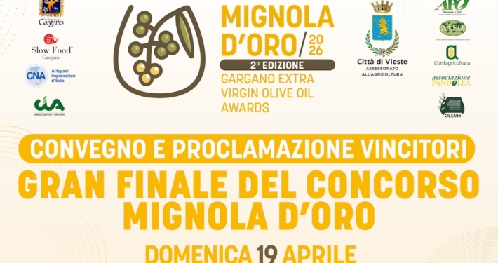 Danila Paradiso2026-04-15 07:45:252026-04-15 07:45:25Extravergine del Gargano: la “rivoluzione possibile” tra qualità, innovazione e identità territoriale. Il tema al centro del convengo della 2^ edizione del Concorso “Mignola D’Oro – Gargano Extra Virgin Olive Oil Award”. Domenica 19 aprile 2026 ore 11.00 – Vieste (Fg).