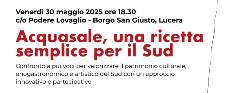 “Acquasale, una ricetta semplice per il Sud”. Un incontro per ripensare il Mezzogiorno tra cultura, partecipazione e sviluppo. Venerdì 30 maggio 2025 ore 18.30, Podere Lovaglio – Borgo San Giusto, Lucera (FG)