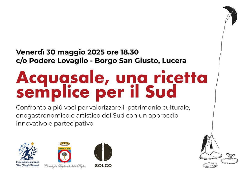 “Acquasale, una ricetta semplice per il Sud” è l’evento in programma venerdì 30 maggio 2025 alle ore 18.30 presso il Podere Lovaglio di Borgo San Giusto a Lucera, nato con l’obiettivo di favorire una riflessione collettiva sulle sfide e le potenzialità del Mezzogiorno, attraverso un approccio innovativo e partecipativo. Cultura, politica attiva, sviluppo sostenibile, enogastronomia e arte saranno le tematiche al centro dell’incontro organizzato dalla Federazione europea Piergiorgio Frassati, con il patrocinio del Consiglio Regionale della Puglia e in collaborazione con Solco Garganico.