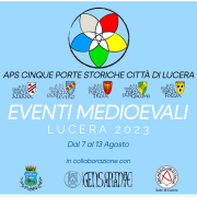 Lucera si veste a festa con gli stendardi delle Cinque Porte ed è pronta per gli “Eventi Medioevali” in programma dall’8 al 13 agosto 2024 organizzati dall’APS Cinque Porte Storiche-Città di Lucera in collaborazione con il Comune di Lucera, con il patrocinio del Ministero della Cultura e della Regione Puglia, con il contributo di Fondazione Puglia e Fondazione dei Monti Uniti di Foggia.