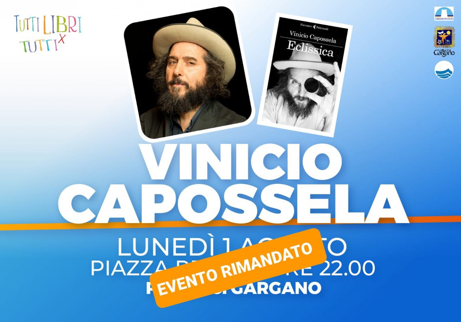 Annullato l’incontro con Vinicio Capossela e Marino Sinibaldi, previsto lunedì 1° agosto 2022 a Peschici nell’ambito della manifestazione “TUTTILIBRI-Libri x Tutti”, giunta quest’anno alla 2^ edizione e organizzata dal Comune di Peschici con la direzione artistica di Michele Afferrante.