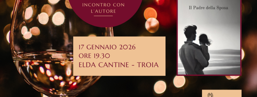 Sabato 17 gennaio 2026 alle ore 19.30 a Troia presso Elda Cantine (Lotto 9, Comparto 21) si terrà l’incontro con Giancarlo Alessandro Stefano Caporale, autore de “Il Padre della Sposa”. A dialogare con lui saranno Rosanna Di Francesco, coordinatrice del progetto “Nessuna si salva da sola”, e Lucia Melchiorre, docente di scuola secondaria. Seguirà un’apericena in cantina.