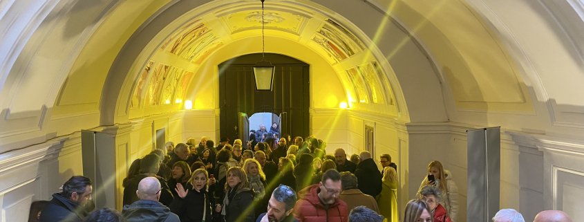 E proprio sui cassettoni ai lati dello stemma sono state posizionate le affiche di Giuseppe Petrilli e Andrea Petrillo, che durante la serata hanno illustrato i loro interventi, tra aneddoti e racconti personali.
