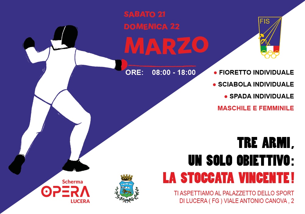 La manifestazione, organizzata dalla Sezione Scherma della Polisportiva Opera Lucera, affiliata alla FIS – Federazione Italiana Scherma, con il patrocinio del Comune di Lucera, vedrà la partecipazione di oltre 200 atleti tra i 10 e i 13 anni. In pedana saliranno giovani schermidori provenienti non solo dalla Puglia, ma anche da Basilicata e Molise.