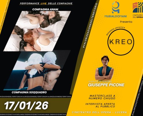 Debutta a Lucera il progetto Kreo: un format innovativo dedicato alla danza con ospite d’eccezione Giuseppe Picone. Il Cineteatro dell’Opera di Lucera si conferma palcoscenico d’eccellenza per la danza internazionale. Sabato 17 gennaio 2026 al Cineteatro dell’Opera di Lucera