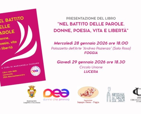 “Nel battito delle parole. Donne, poesia, vita e libertà”. Doppia presentazione del libro della community DEA #donnecheammiro fondata da Mariangela Cassano. La raccolta esplora il forte legame tra la voce delle donne e il potere generatore della poesia. Il 28 gennaio al Palazzetto dell’Arte di Foggia e il 29 gennaio al Circolo Unione di Lucera.