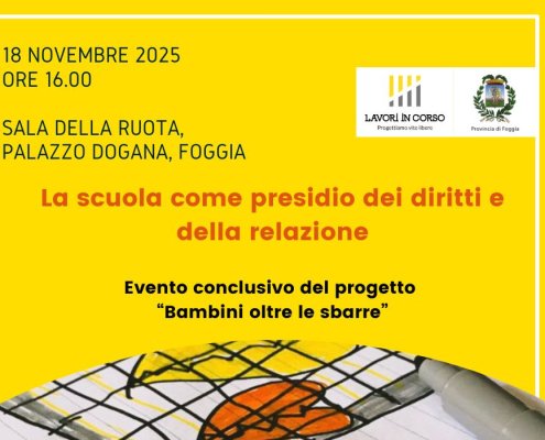 “La scuola come presidio dei diritti e della relazione”: seminario di approfondimento del progetto “Bambini oltre le sbarre”. L’incontro chiude il progetto realizzato da Lavori in Corso Aps, sostenuto dall’Ufficio del Garante regionale delle persone private della libertà personale, e annuncia una nuova fase di lavoro. Martedì 18 novembre 2025 ore 16.00, Sala della Ruota di Palazzo Dogana, Foggia.