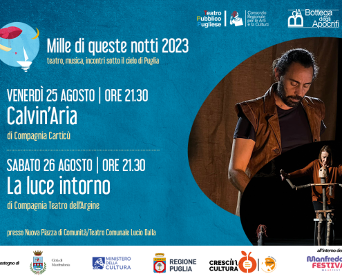 “Mille di queste notti” continua con “Calvin’Aria” della compagnia Carticù e “La luce intorno” di Teatro dell’Argine. Venerdì 25 e sabato 26 agosto 2023, nella Nuova piazza di Comunità a Manfredonia.