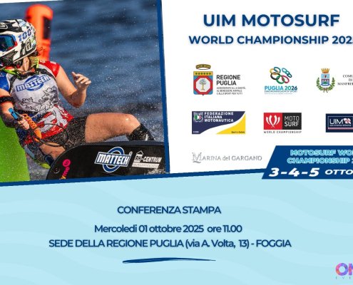 Conferenza di presentazione del Motosurf World Championship 2025. Mercoledì 1° ottobre 2025 ore 11.00 a Foggia c/o la sede della Regione Puglia (via A. Volta 13). La 4^ edizione del Campionato Mondiale di MotoSurf si terrà dal 3 al 5 ottobre al Porto Turistico di Manfredonia.