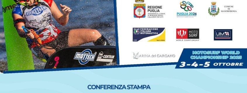 Conferenza di presentazione del Motosurf World Championship 2025. Mercoledì 1° ottobre 2025 ore 11.00 a Foggia c/o la sede della Regione Puglia (via A. Volta 13). La 4^ edizione del Campionato Mondiale di MotoSurf si terrà dal 3 al 5 ottobre al Porto Turistico di Manfredonia.