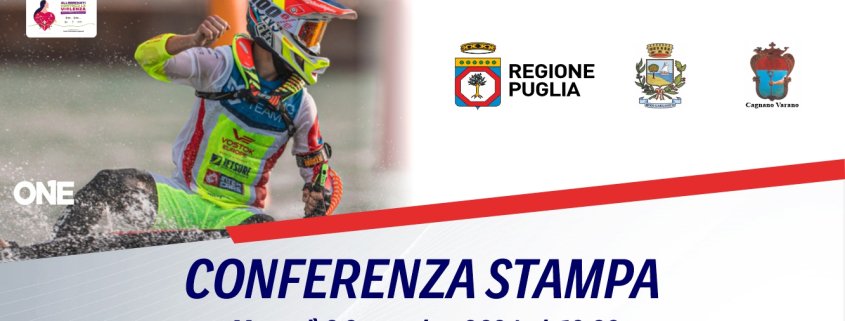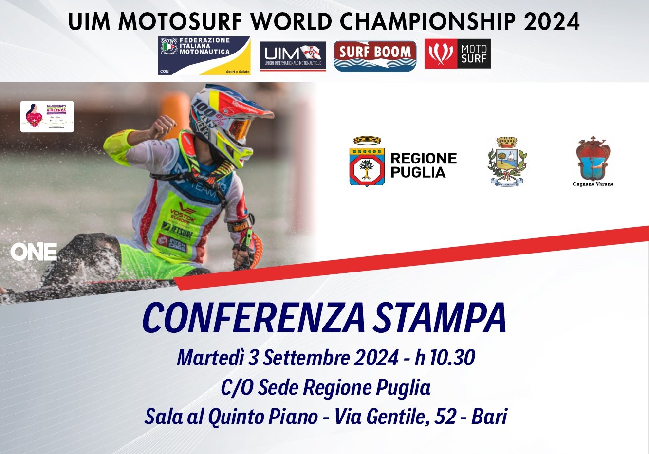 Conferenza stampa di presentazione del MotoSurf World Championship 2024. Martedì 3 settembre 2024 ore 10.30 a Bari nella Sala al 5° piano della sede della Regione Puglia in via Gentile 52. Sarà illustrato il programma della 3^ edizione del Campionato Mondiale di MotoSurf che si terrà dal 6 all’8 settembre a Rodi Garganico.