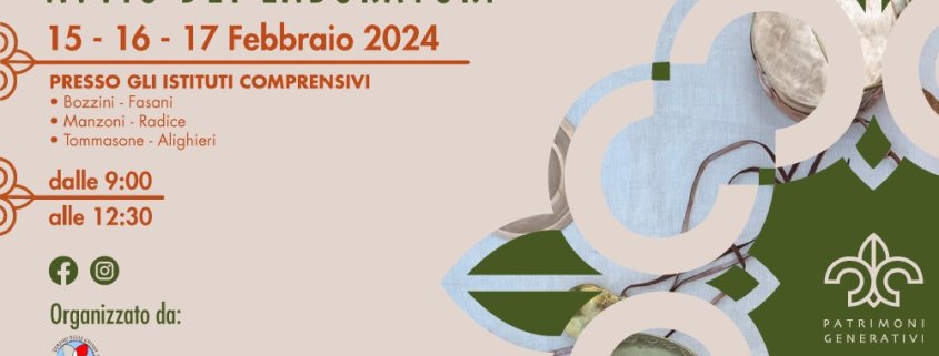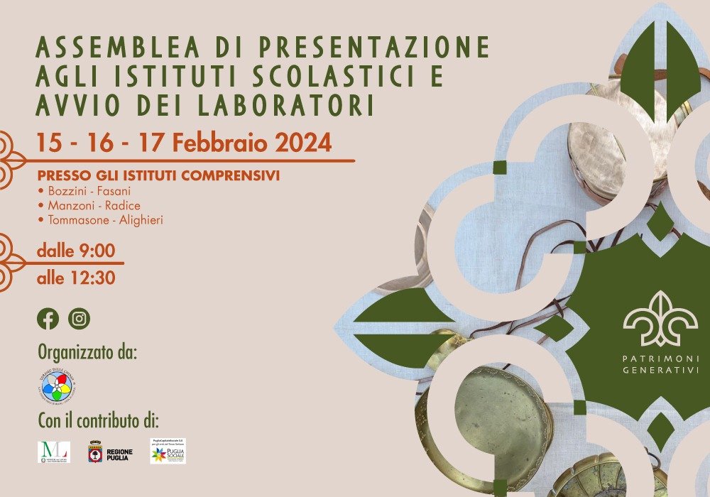 Continua “Patrimoni Generativi” con le assemblee di presentazione e i laboratori rivolti a circa 600 studenti. Dal 15 febbraio presso gli istituti comprensivi “Manzoni Radice”, “Tommasone Alighieri” e “Bozzini Fasani” di Lucera.