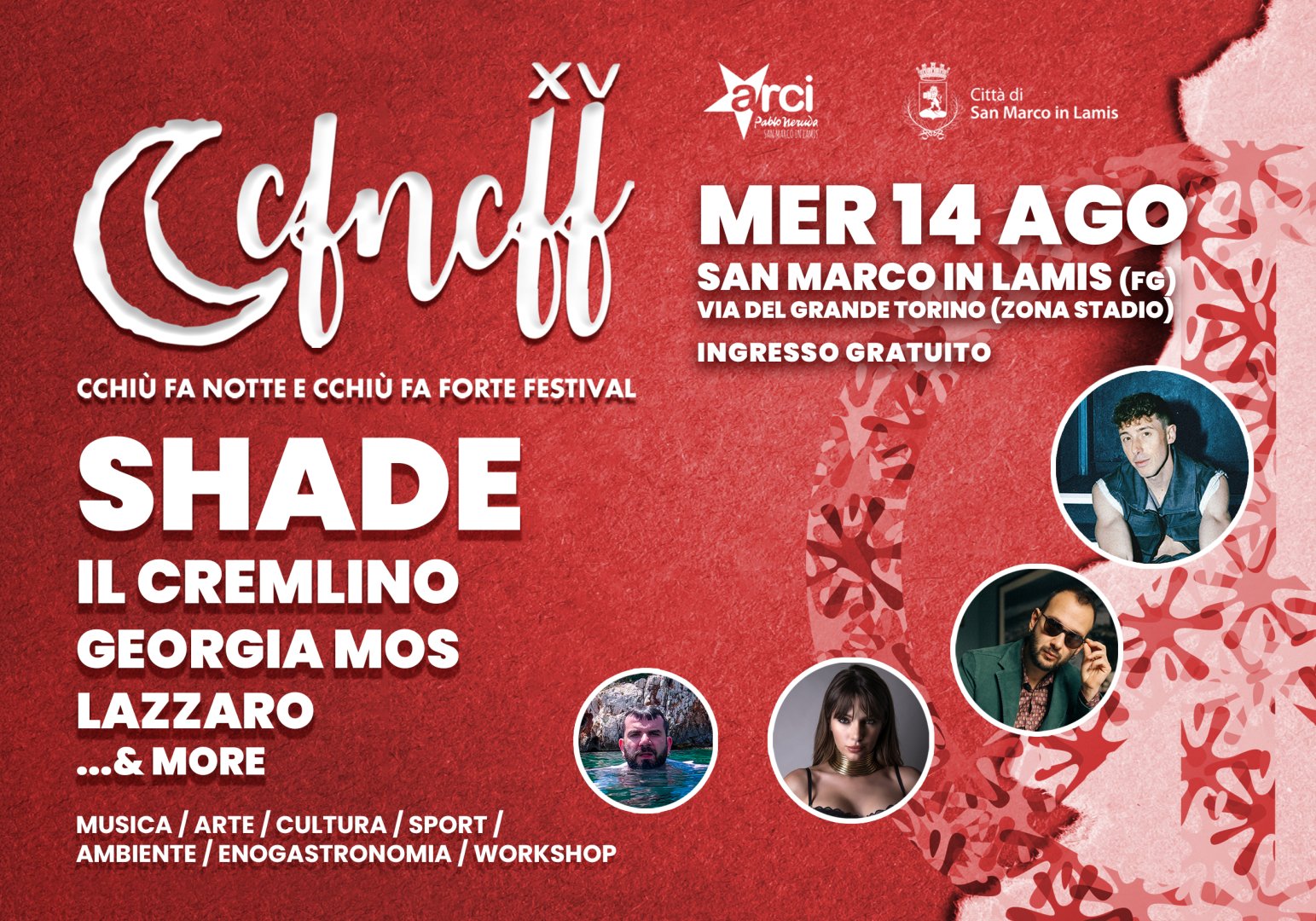 È tutto pronto per la 15^ edizione di “Cchiù fa Notte e Cchiù fa Forte Festival” in programma mercoledì 14 agosto 2024 a San Marco in Lamis, organizzato dall’Arci Pablo Neruda in collaborazione e con il patrocinio del Comune di San Marco in Lamis.