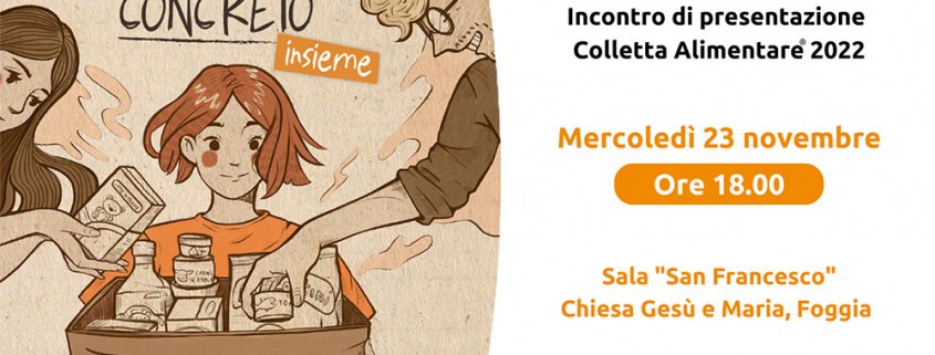 Incontro di presentazione della 26° Giornata Nazionale della Colletta Alimentare. Mercoledì 23 novembre 2022 ore 18.00, c/o la Sala “San Francesco” della Chiesa Gesù e Maria a Foggia.