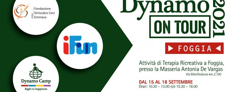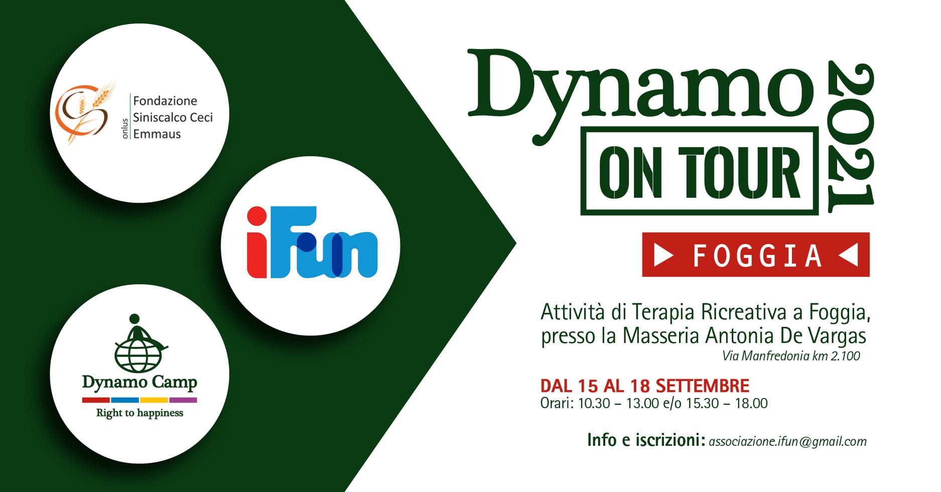Dal 15 al 18 settembre, l’associazione iFun ospiterà a Foggia lo Staff di Dynamo Camp, il camp di terapia ricreativa, primo in Italia, strutturato per ospitare bambini affetti da patologie gravi o croniche in terapia e nel periodo di post ospedalizzazione. Sarà presente, in particolare lo Staff dei Dynamo Programs, che porta i programmi Dynamo fuori dal Camp in ospedali e associazioni di tutta Italia.
