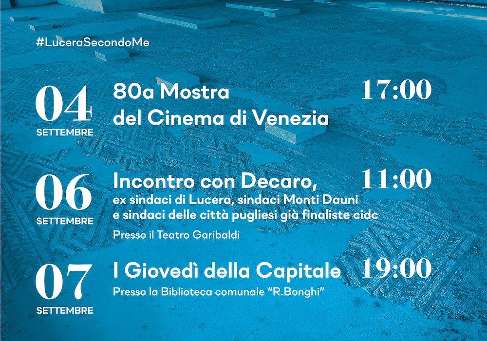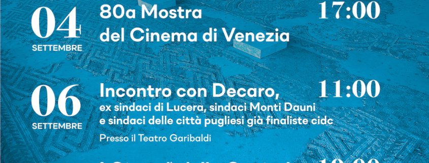 “Lucera 2026” alla 80a Mostra del Cinema di Venezia con “Mònde – Festa del Cinema sui Cammini” per il progetto “Capitali pugliesi della Cultura”. Prossimi appuntamenti: il 6 settembre alle 11 incontro con Antonio Decaro al Teatro Garibaldi. Il 7 e il 14 settembre i Giovedì della Capitale.