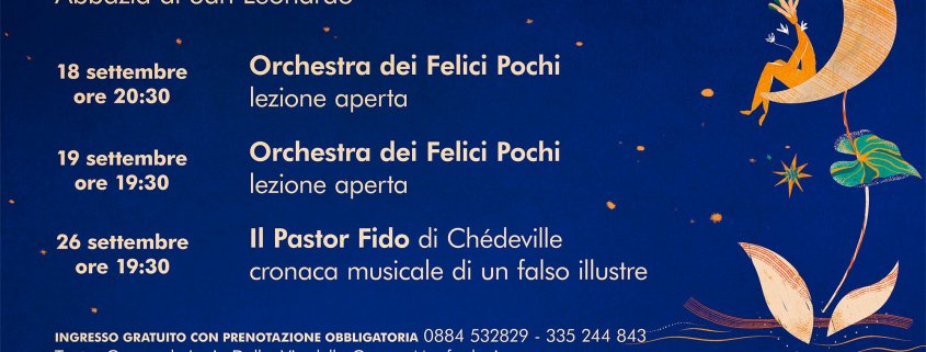 Sabato 18 settembre alle ore 20.30 e domenica 19 alle 19.30 si terrà la Lezione concerto con l’Orchestra dei Felici Pochi, a cura del M° Fabio Trimigno, a chiusura del progetto “L’anno che verrà”, sostenuto dalla Regione Puglia attraverso il Teatro Pubblico Pugliese con la “Programmazione Custodiamo la cultura in Puglia”.