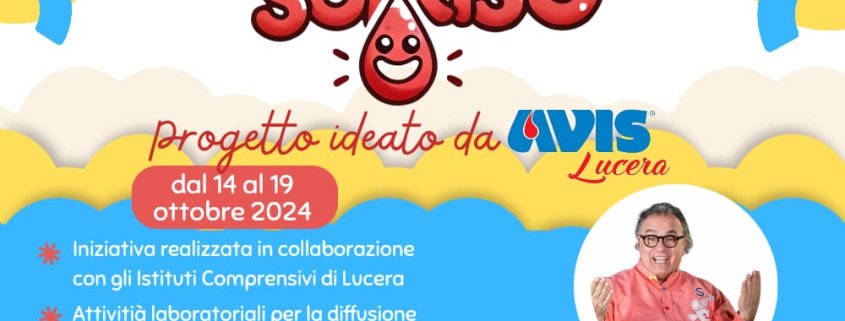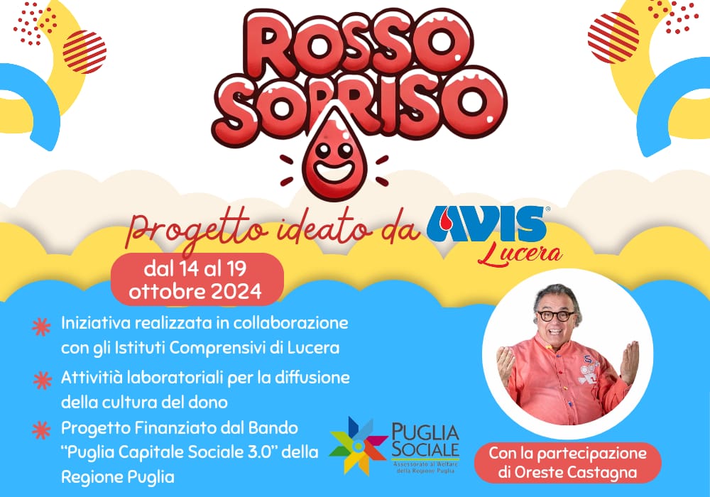 Oreste Castagna dà il via a “Rosso Sorriso” con l’Avis di Lucera. Il progetto, finanziato dal bando “Puglia Capitale Sociale 3.0”, vuole sensibilizzare le nuove generazioni al dono. Dal 14 al 19 ottobre laboratori nei tre Istituti Comprensivi della città. I disegni e i personaggi ideati dagli alunni saranno fonte di ispirazione per un fumetto che verrà realizzato nella seconda fase del progetto.