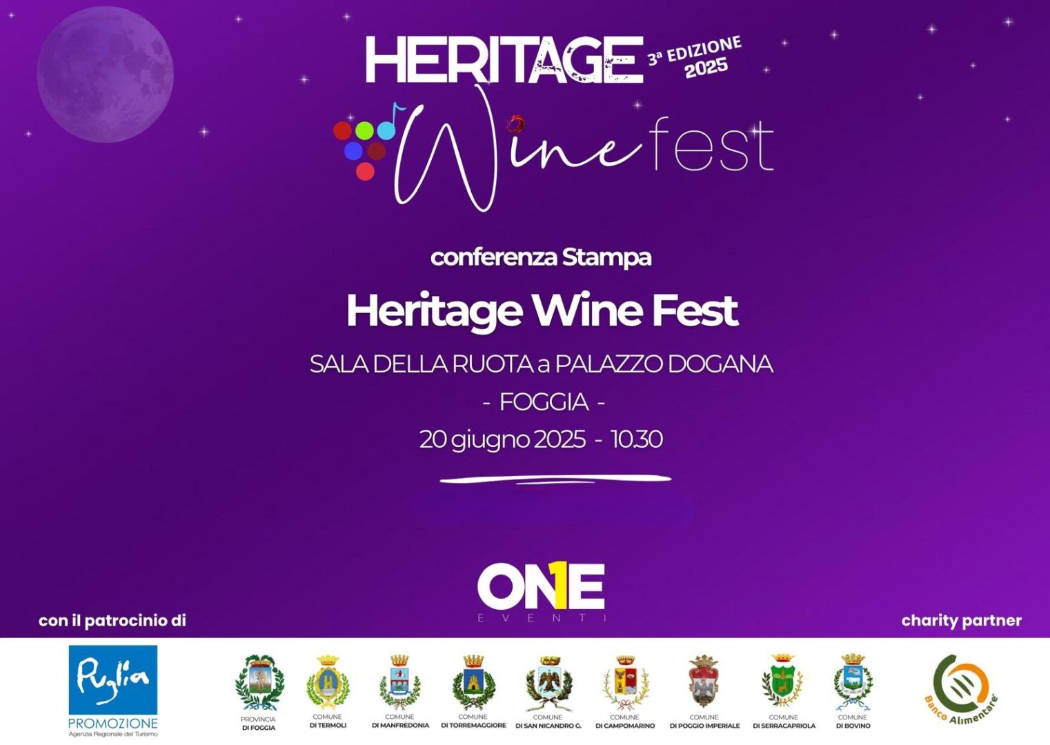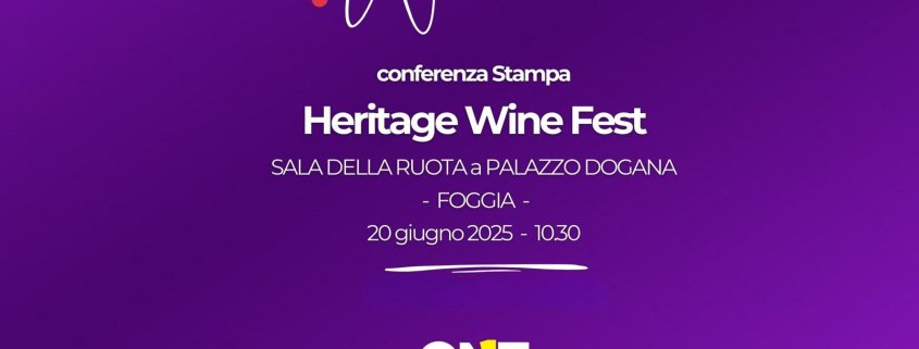 Conferenza stampa di presentazione della 3^ edizione di “Heritage Wine Fest”. Il festival che promuove vino e cultura tra borghi e castelli. Venerdì 20 giugno 2025 ore 10.30, Sala della Ruota di Palazzo Dogana, Foggia.