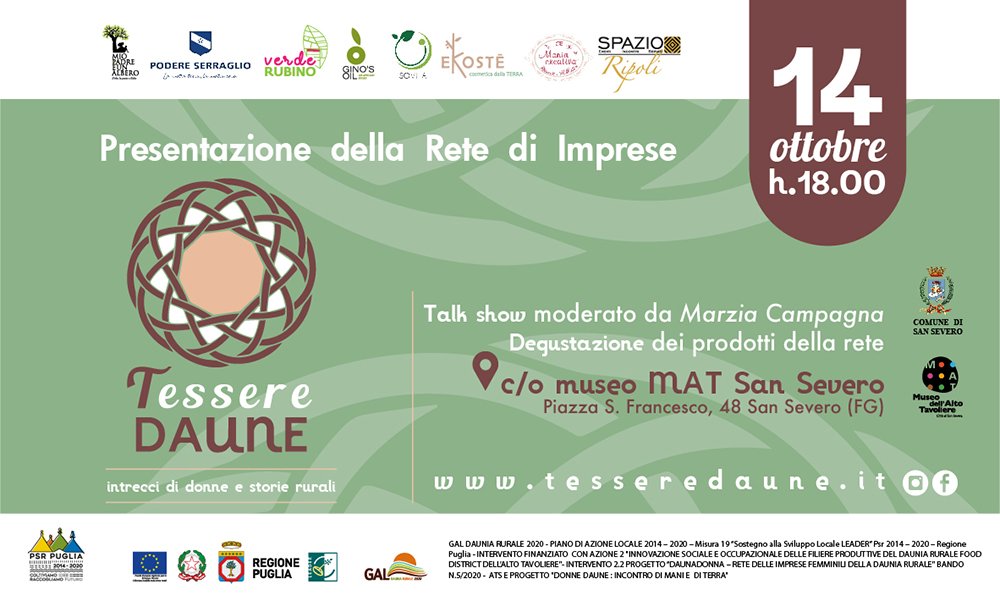 GAL Daunia Rurale 2020 – Piano di Azione Locale 2014-2020 – Misura 19 “Sostegno alla Sviluppo Locale LEADER” Psr 2014-2020 – Regione Puglia – Intervento finanziato con azione 2 “Innovazione sociale e occupazionale delle filiere produttive del Daunia Rurale Food District dell’Alto Tavoliere” – Intervento 2.2 Progetto “Daunadonna – rete delle imprese femminili della Daunia rurale” bando n.5/2020 – ATS e progetto “Donne Daune: incontro di mani e di terra”.