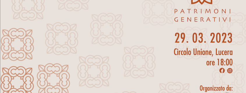 Presentazione di “Patrimoni Generativi”, il progetto dell’APS Cinque Porte Storiche Città di Lucera finanziato dal bando “Puglia Capitale Sociale 3.0”. Mercoledì 29 marzo 2023 ore 18.00, Circolo Unione – Lucera.