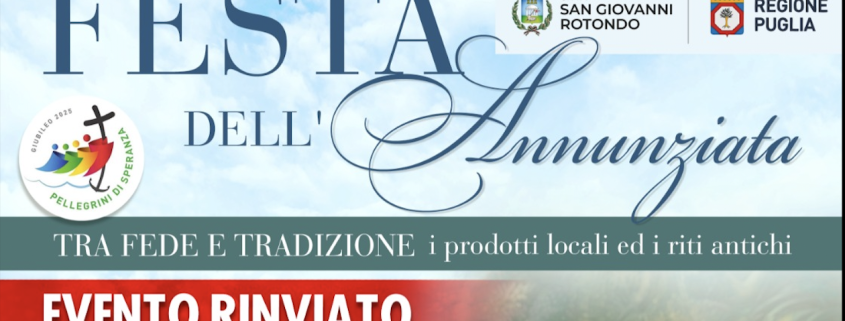 Rinviata, a causa delle previsioni meteo avverse, la Festa dell’Annunziata a San Giovanni Rotondo. Sabato 5 e domenica 6 aprile 2025 c/o la Chiesa dell’Annunziata in Località Matine.