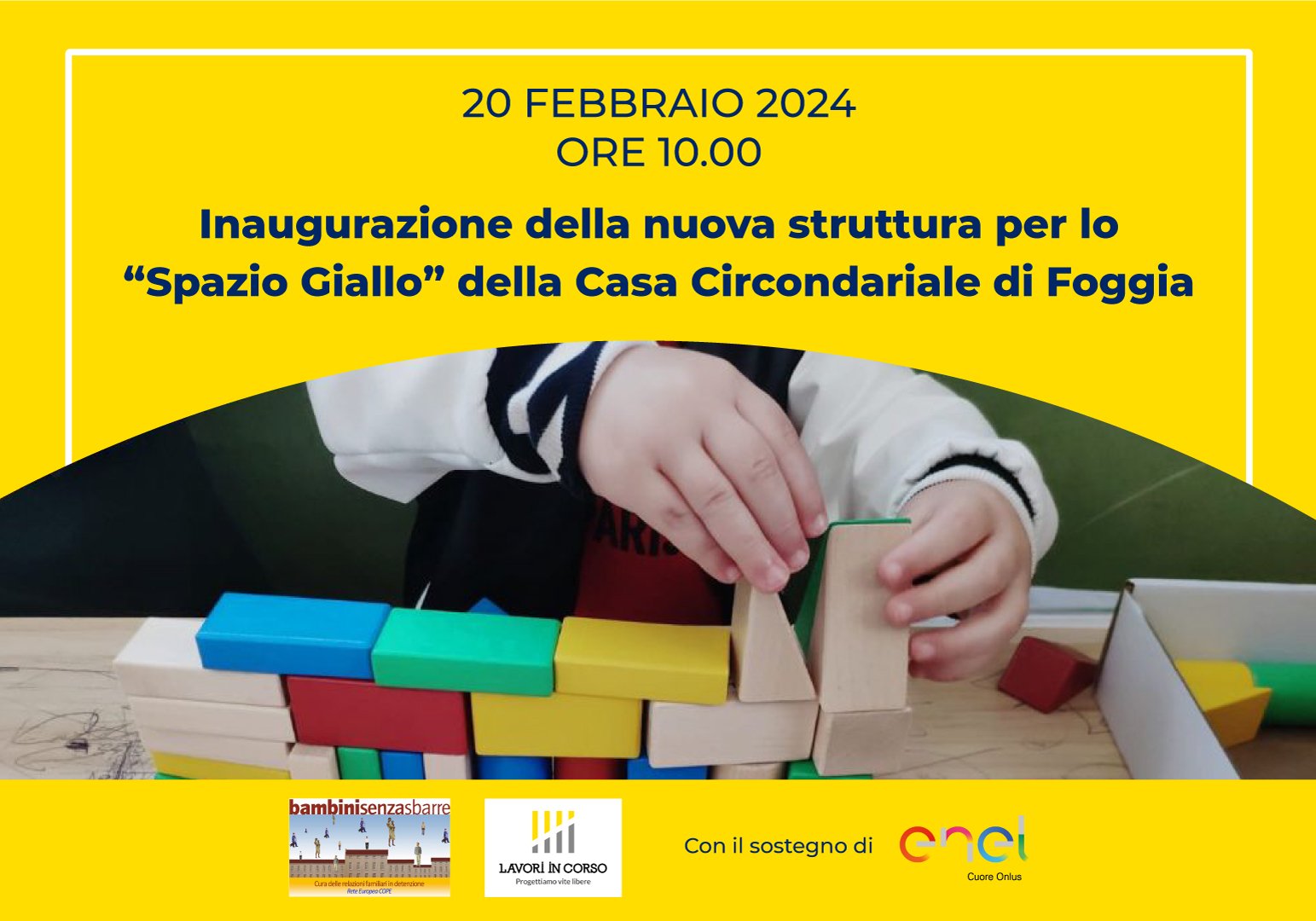 Si inaugura la nuova struttura adibita a Spazio Giallo per i bambini nel carcere di Foggia. Martedì 20 febbraio 2024 alle ore 10.00.