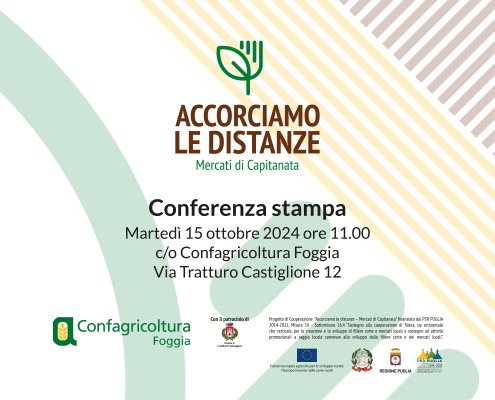 Conferenza stampa di presentazione del progetto “Accorciamo le distanze – Mercati di Capitanata” promosso da Confagricoltura Foggia. Martedì 15 ottobre 2024 ore 11.00 presso Confagricoltura Foggia (via Tratturo Castiglione 12).