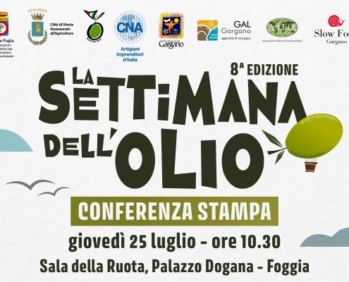 Conferenza stampa di presentazione de “La Settimana dell’Olio 2024”. Giovedì 25 luglio ore 10.30, nella Sala della Ruota di Palazzo Dogana a Foggia. Sarà illustrato il programma dell’8^ edizione della manifestazione che si terrà dal 26 al 30 agosto 2024 a Vieste.
