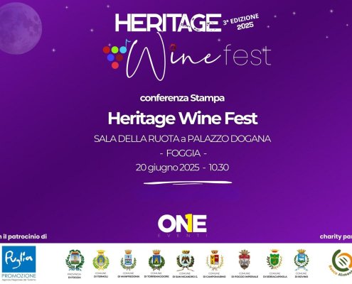 Conferenza stampa di presentazione della 3^ edizione di “Heritage Wine Fest”. Il festival che promuove vino e cultura tra borghi e castelli. Venerdì 20 giugno 2025 ore 10.30, Sala della Ruota di Palazzo Dogana, Foggia.