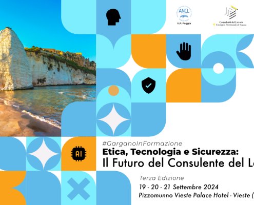 Etica, tecnologia e sicurezza: il Futuro del Consulente del Lavoro. Il titolo della 3^ edizione di #garganoinformazione. Tre giorni di dibattiti, tavole rotonde e momenti di confronto organizzati da Ordine dei Consulenti del Lavoro, ANCL Foggia e ANGCL Foggia. Dal 19 al 21 settembre 2024 a Vieste.