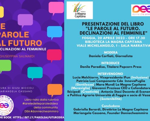 Le parole al futuro. Presentazione del libro di Giuseppina Salinardi, a cura di Giusi Miccoli e Mariangela Cassano, nato dall’esperienza della community #Donnecheammiro. Giovedì 20 aprile h 17.30, Sala Narrativa della Biblioteca “La Magna Capitana” di Foggia.