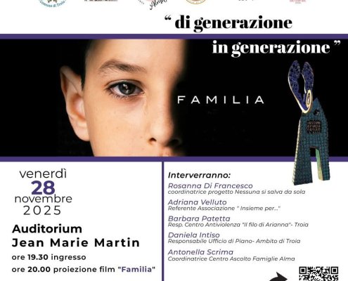 Proiezione speciale del film “Familia” nell’ambito del progetto “Nessuna si salva da sola” e lancio della campagna di crowdfunding per realizzare la scultura “Ali di libertà”. Venerdì 28 novembre 2025 ore 19.30, Auditorium Jean Marie Martin, Troia.