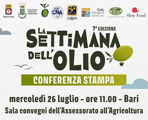 Conferenza stampa di presentazione de “La Settimana dell’Olio 2023”. Mercoledì 26 luglio ore 11.00, nella Sala convegni dell’Assessorato regionale all’Agricoltura a Bari. Sarà illustrato il programma della 7^ edizione della manifestazione che si terrà dal 28 agosto al 1° settembre 2023 a Vieste.