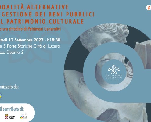 “Modalità alternative di gestione dei beni pubblici del patrimonio culturale”: il 1° Forum cittadino di “Patrimoni Generativi”. L’incontro è aperto a tutti i portatori di interesse del settore culturale e turistico della città e sarà l’occasione per avviare un confronto tra i cittadini sull’opportunità di individuare più efficaci ed efficienti modelli gestionali dei beni culturali e monumentali di Lucera. Martedì 12 settembre ore 18.30, sede A.P.S. Cinque Porte Storiche (piazza Duomo 2), Lucera.