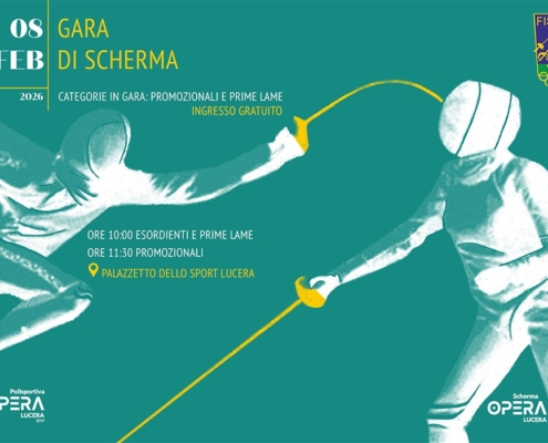 Scherma: l’8 febbraio al Palazzetto dello Sport di Lucera la gara under 10. Attesi circa 50 giovani atleti da tutta la Puglia. Partecipazione gratuita al Corso di Scherma fino a maggio, per chi si iscrive durante la gara.
