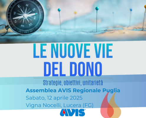 Le nuove vie del dono: assemblea regionale AVIS a Lucera. Focus su donazione di sangue e protezione civile. Presente anche il Presidente AVIS Nazionale Gianpietro Briola. Sabato 12 aprile 2025 dalle ore 10.00 presso Grand Hotel Vigna Nocelli, Lucera.