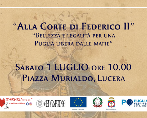 “Alla Corte di Federico II” con I Diversabili: l’associazione apre le porte a bambini e ragazzi della città. Per una mattinata all’insegna del divertimento, dell’arte, della storia ma anche dell’inclusione e dell’integrazione. Laboratori con esperti, storie e indovinelli su Federico II con Gens Capitanatae. Sabato 1° luglio alle ore 10.00 nel giardino dell’associazione I Diversabili, in pizza Murialdo, a Lucera.