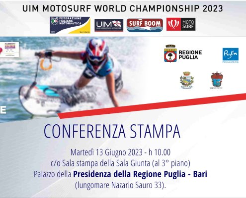 Conferenza stampa di presentazione del Motosurf World Championship 2023. Martedì 13 giugno 2023 ore 10.00, a Bari c/o il Palazzo della Presidenza della Regione Puglia. Sarà illustrato il programma della 2^ edizione del Campionato Mondiale di MotoSurf che si terrà dal 16 al 18 giugno a Rodi Garganico.