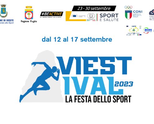 Viestival 2023: la festa dello sport. Eventi, formazione e incontri a tema con il campione mondiale di nuoto Domenico Acerenza, il comico Gene Gnocchi, gli ex calciatori Beppe Signori e Maurizio Iorio, il mental coach Stefano Massari e il giornalista sportivo Domenico Carella. Dal 12 al 17 settembre 2023 a Vieste, città candidata a Comune Europeo dello Sport 2025.