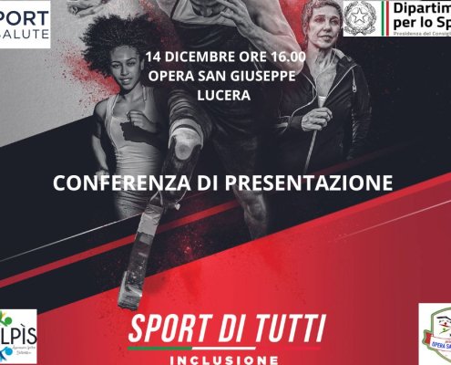 Presentazione di “All you can… sport” e “Tutti per uno, una racchetta per tutti”. I due progetti “made in Lucera” che si sono aggiudicati il finanziamento “Sport di tutti – Inclusione”. Giovedì 14 dicembre 2023 ore 16.00, Sala conferenze dell’Opera San Giuseppe, Lucera.