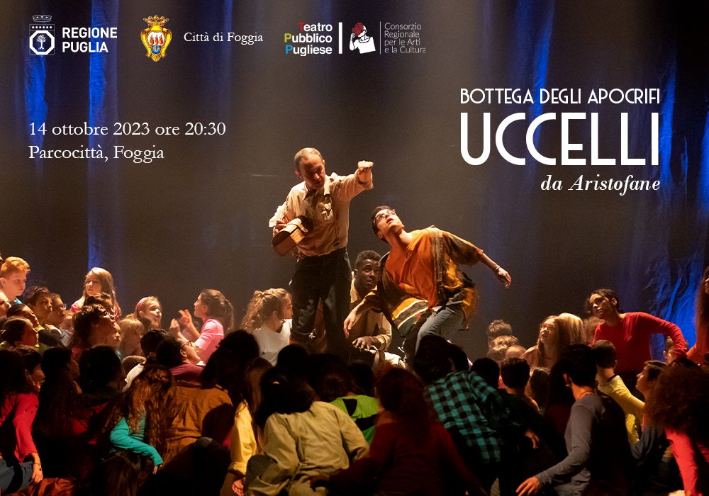 “Uccelli” in volo a Foggia. In scena 100 bambini e ragazzi della città per la produzione di comunità della Compagnia Bottega degli Apocrifi con il Comune di Foggia, Teatro Pubblico Pugliese e quattro istituti scolastici, all’interno del progetto “Fermenti di Antimafia”. Sabato 14 ottobre 2023 alle ore 20.30 a Parcocittà, Foggia.